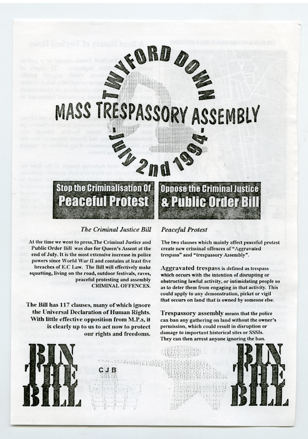 The following spring, an alliance of different groups involved in opposing the Criminal Justice Bill decided to stage a large summer demonstration against it. The groups wanted to gather not in London, the traditional stage for large rallies, but at a place relevant to the actions and lifestyles targeted by the Bill. Stonehenge, site of free festivals and solstice celebrations, was discussed as a possible location, but Twyford Down was chosen as being equally relevant, easy to access and with the potential for using the broad sweep of Plague Pits Valley for a rally. The mass trespass into the Cutting would be the final such protest before the new road opened to traffic.